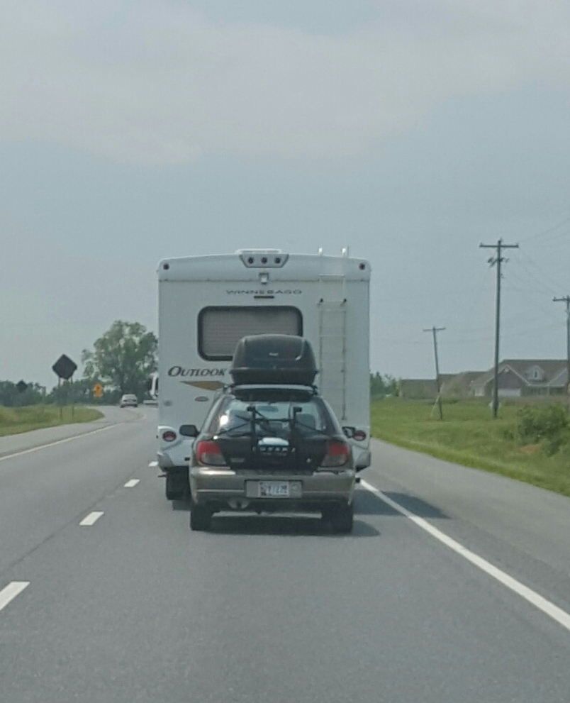 We had initially planned to tow our trusty 2004 Subaru Forester behind us, but soon learned that we couldn’t do this unless we used a trailer since she’s an AWD transmission. So, we set out to find a manual transmission car to serve as our tow car, or “toad,” and were happy to find an old but seemingly sturdy stick shift (also a Subaru). After getting her fitted with a base plate and buying a tow bar to attach her to the Woodebago (not cheap, but cheaper than a trailer), we thanked the awesome service people at Beckley’s and drove the toad and the Woodebago home to our house. Here they are, hitched together for the first time. We hope they will have a long and happy journey together.