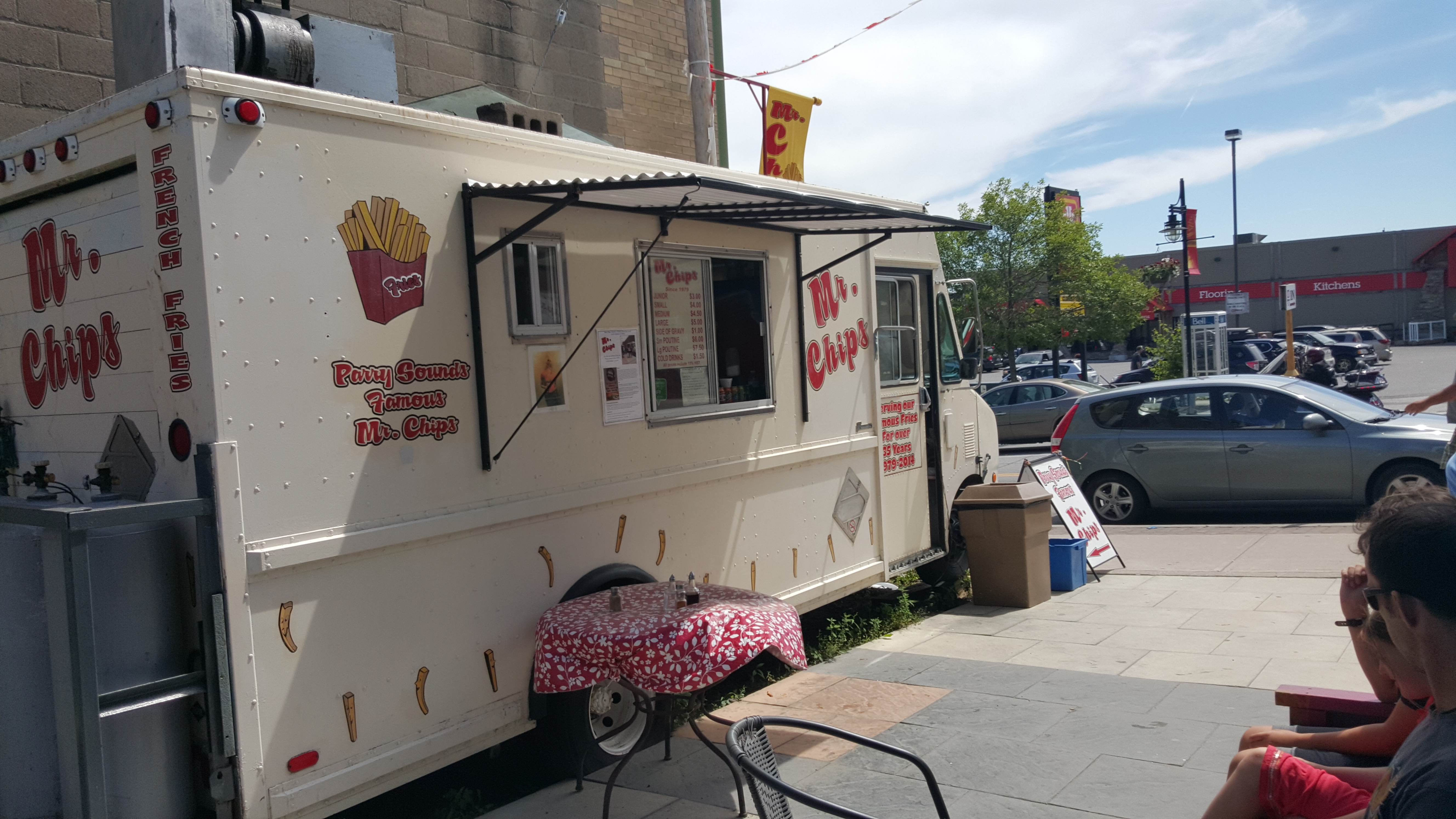 We lunched at Parry’s finest, Mr. Chips, which is like the Thrasher’s Fries of the Georgian Bay, with french fries served in big paper cups with vinegar and ketchup on the side table next to the truck.