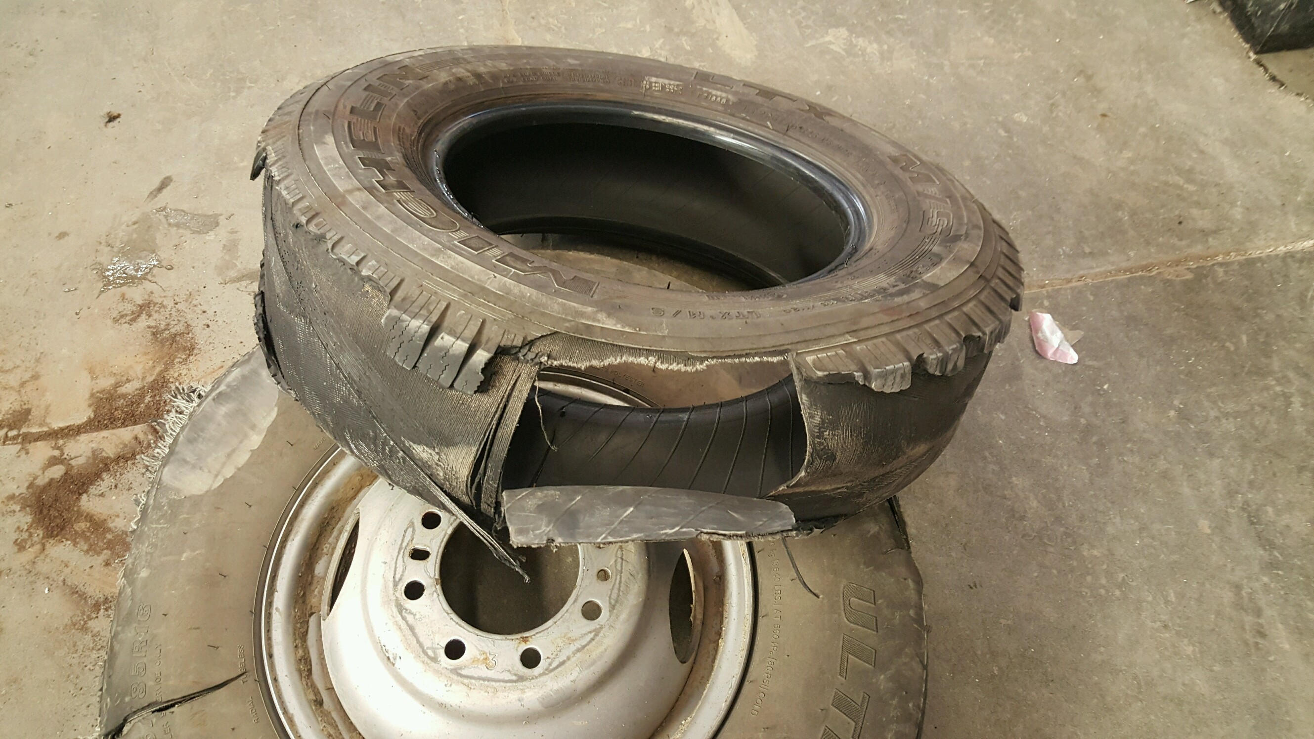 The road was flat and easy by now. The kids were playing on their kindles, buckled in next to each other on the couch, and we were listening to the radio, when we heard what sounded like an explosion. Some combination of us (mostly me) screamed and we pulled over onto the shoulder, immediately relieved that we were all okay (and not up on the mountain). We got out to see that a back inside tire had blown, which ruptured the wheel well.