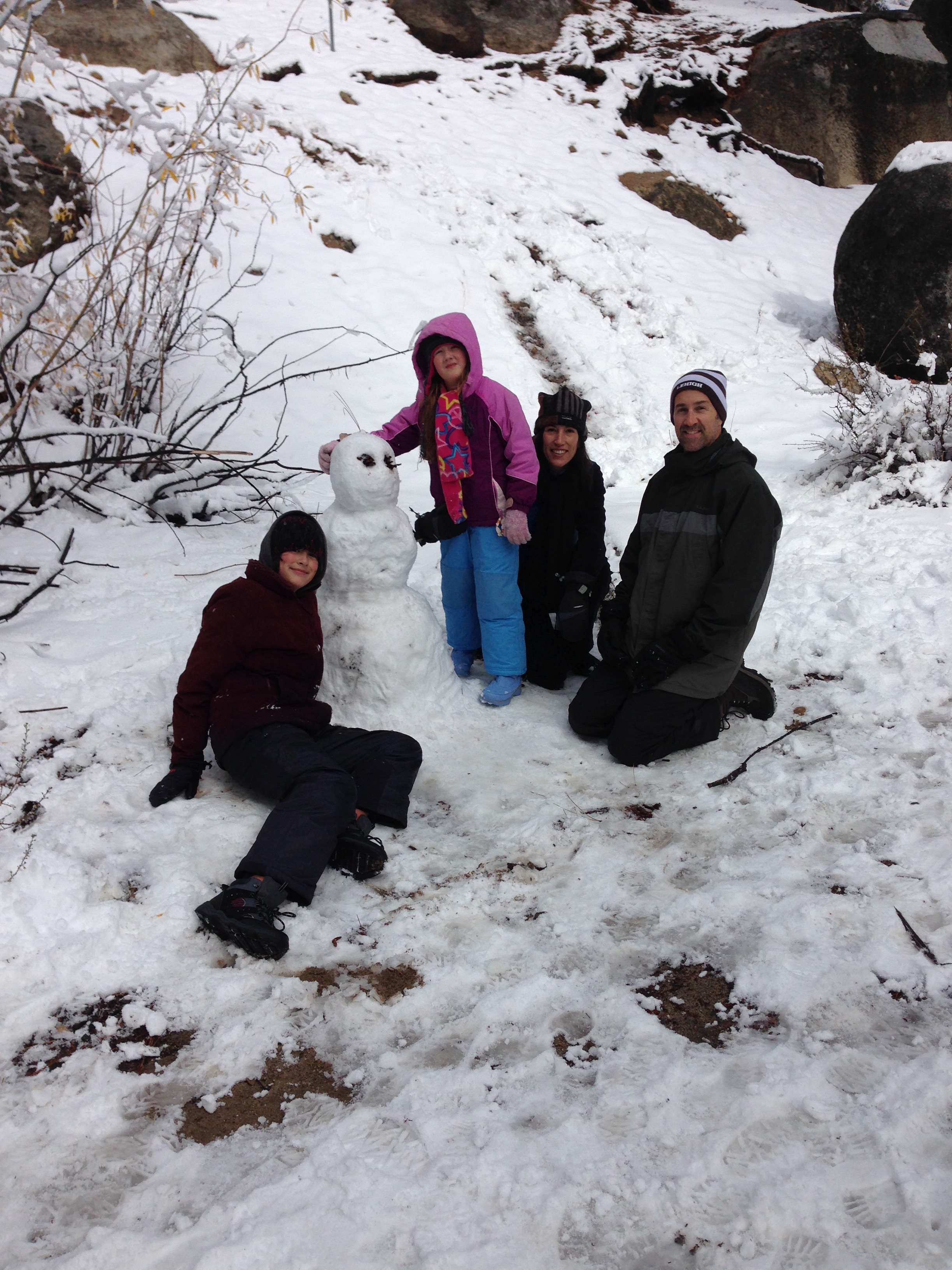 The next day brought even more snow and the chance to call it a snow day and cancel school. Building a snow penguin and a sled run down the back hill seemed more pressing than fractions and grammar for the day. Fifty yards long and with a slope that we napkin-calculated at 20+ percent, the sled run required some risky maneuvers. After a treacherous death-run by Rick, who gained way too much speed and plowed past the trail into a tree, we stood in pairs at the bottom to catch and save each sledder. Some of us have more bumps and bruises than others but we all survived to enjoy hot drinks by a warm fire.