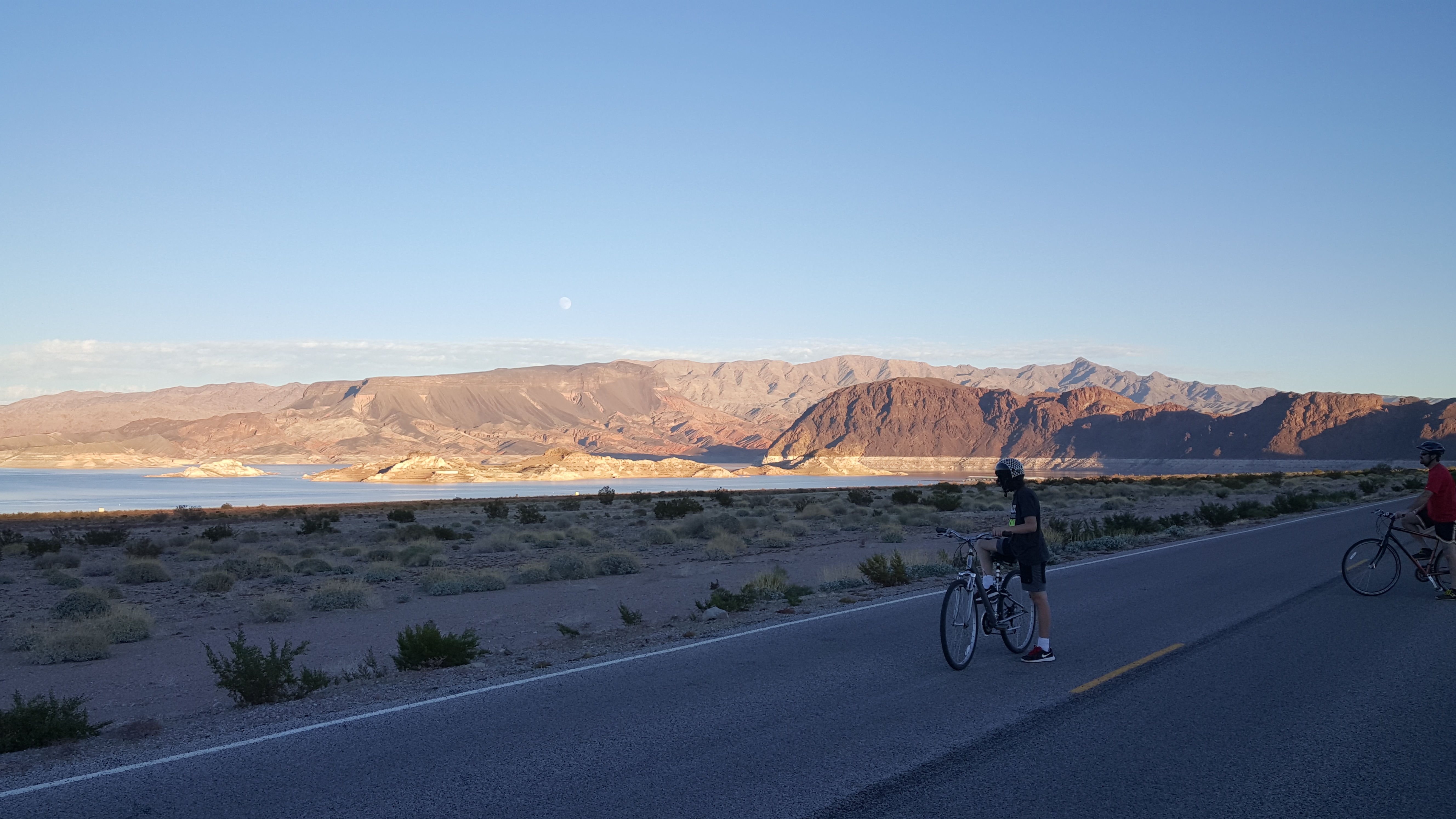 We managed a day and a half of school and spent many hours looking for a place to get our hot water heater checked out (no luck; every place was booked), but otherwise just relaxed in nature. We took bike rides and long walks, looking for but not finding desert tortoises or big horn sheep, and watched the sun set and a full moon rise from behind the mountains. And then we traded in the natural wonders for the unnatural wonders, first for a day on the Las Vegas strip and then for a slice of the hotel life.