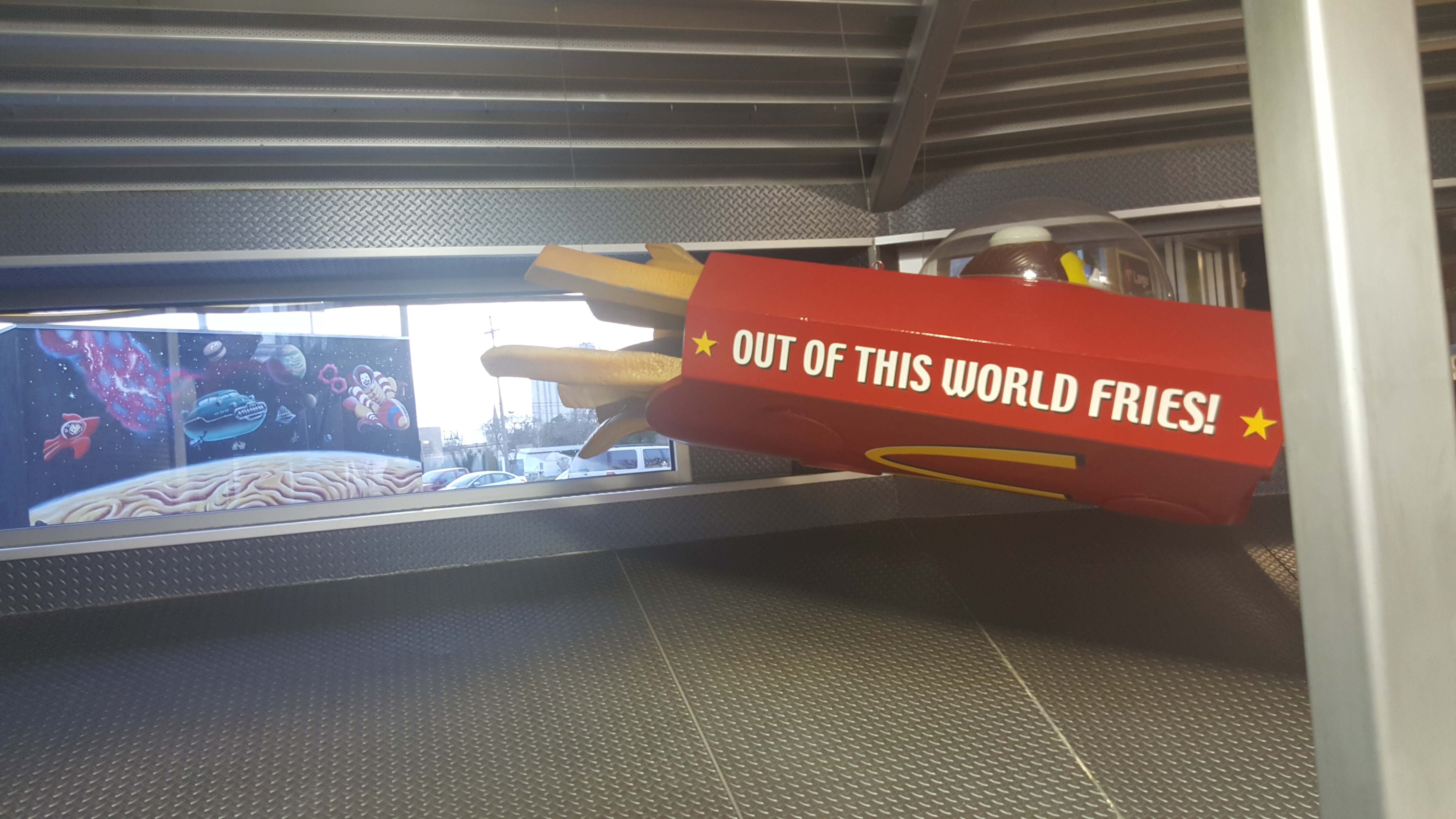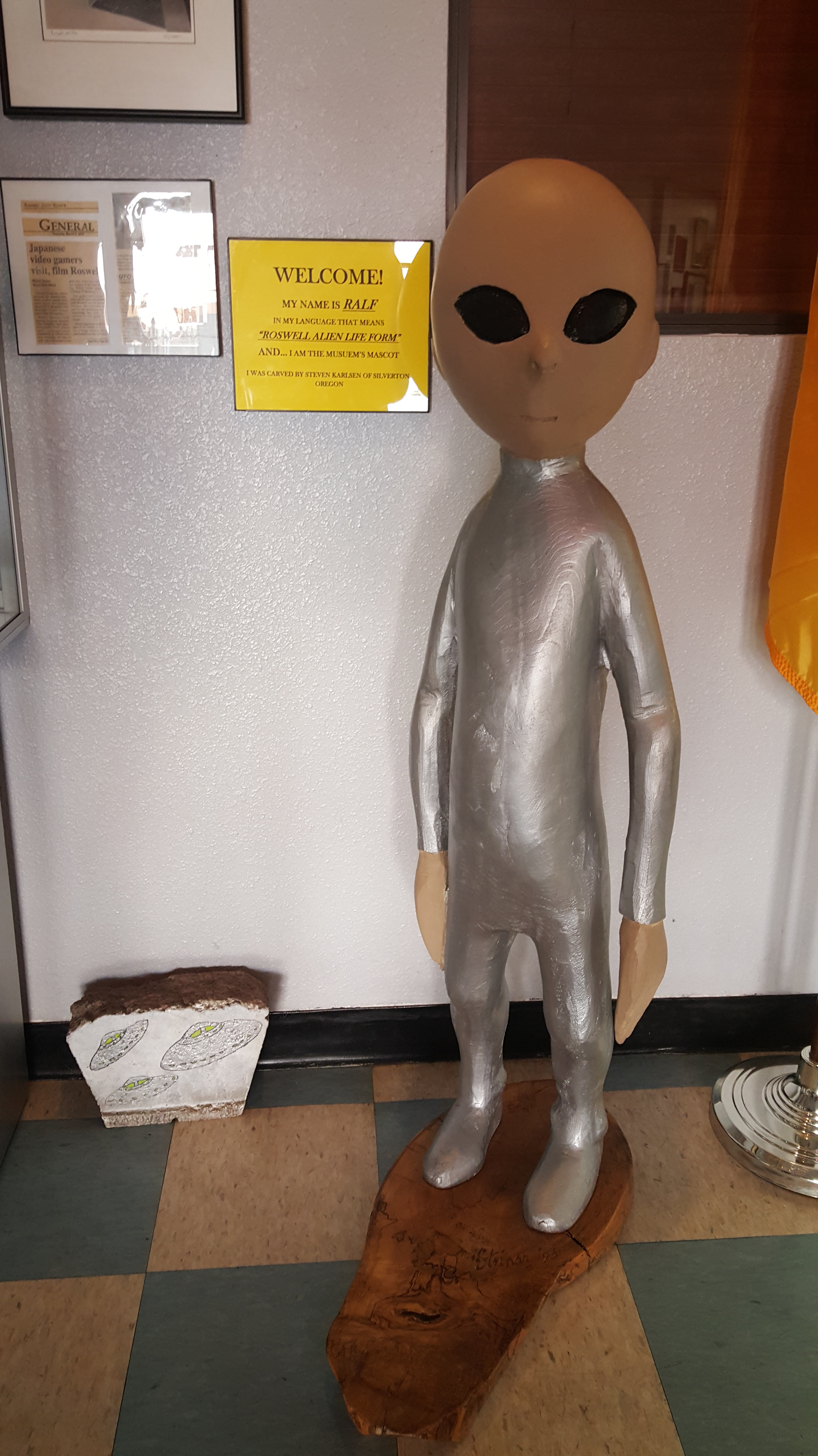 Did you think we had been abducted? No, we are alive and well here in Roswell, New Mexico, although little green men are all over, poking their heads above signs, decorating doorways, and glowing in the night. The town’s celebration of the 1947 crash is everywhere, part kitschy tourism– keychains, mugs, and bumper stickers (“Believe!” and “UFOs are real! The Air Force Doesn’t Exist“)–and part true believers, convinced there was a cover-up and awaiting a second coming. Main Street is lined with alien-themed gift shops and museums, including the International UFO Museum and Research Center (the research center was closed during our visit but RALF–Roswell Alien Life Form–was there to greet us). Even the public library and the local McDonalds have alien décor.