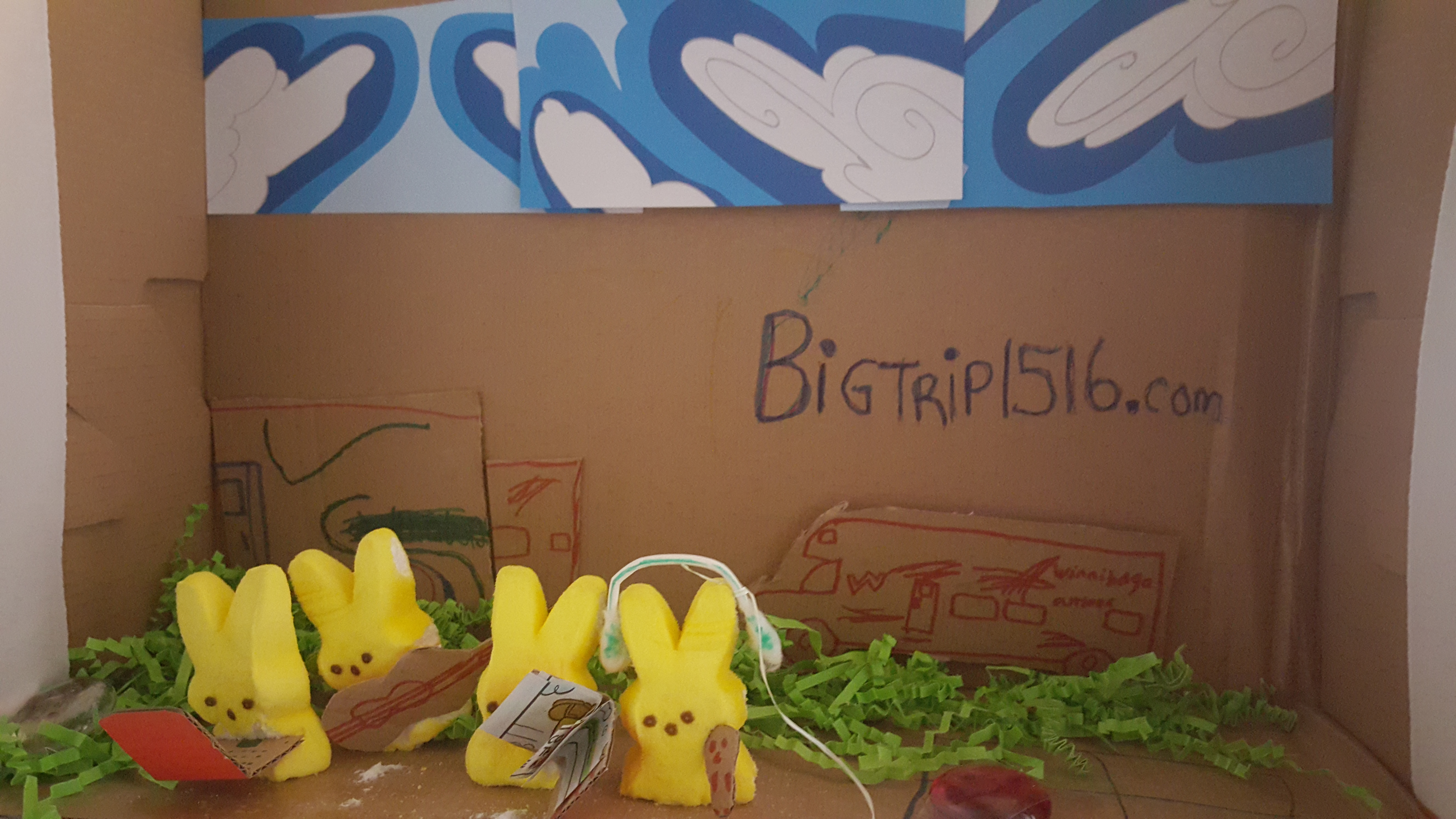 The house we rented is a sweet little place, with two nicely furnished bedrooms, two full bathrooms, a big living room with comfy couches, a kitchen stocked with pots and pans and new appliances, and a washer and dryer. Little aliens are creatively staged throughout the house and out back, where there’s a yard of yellow scratchy grass–nothing will be green here until spring–and a hammock that swings in the dusty winds. We’ve been baking, cooking, reading, watching movies and doing as much online learning as we can while we have Internet. We even made a BigTrip Peep Diorama! During the first week, the kids got some sort of stomach bug (pre-Peeps), which was too bad but really couldn’t have been better timing. Here, we have extra beds and linens, showers, laundry and plenty of water to wash away all that needed to be washed away that week.
