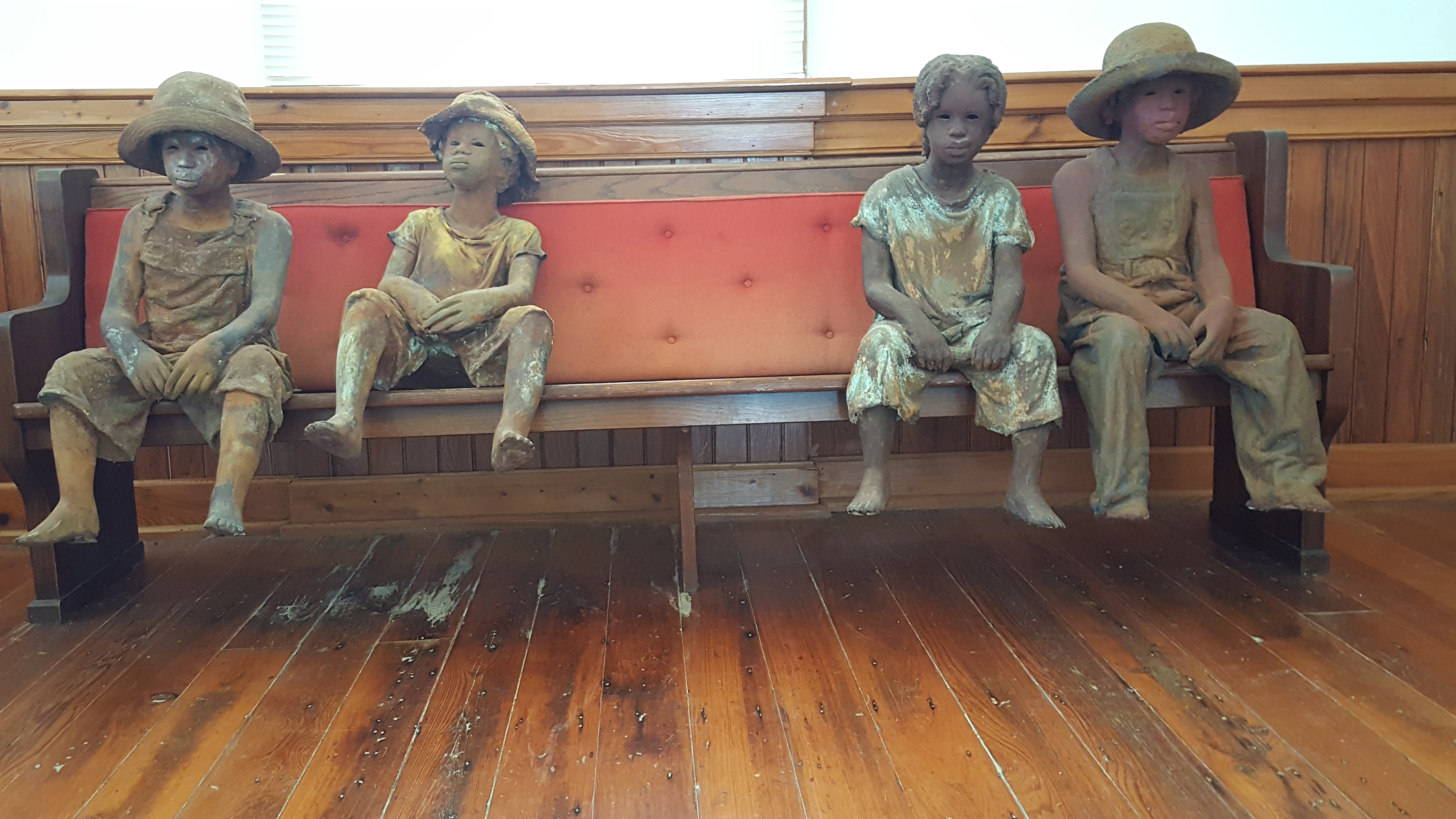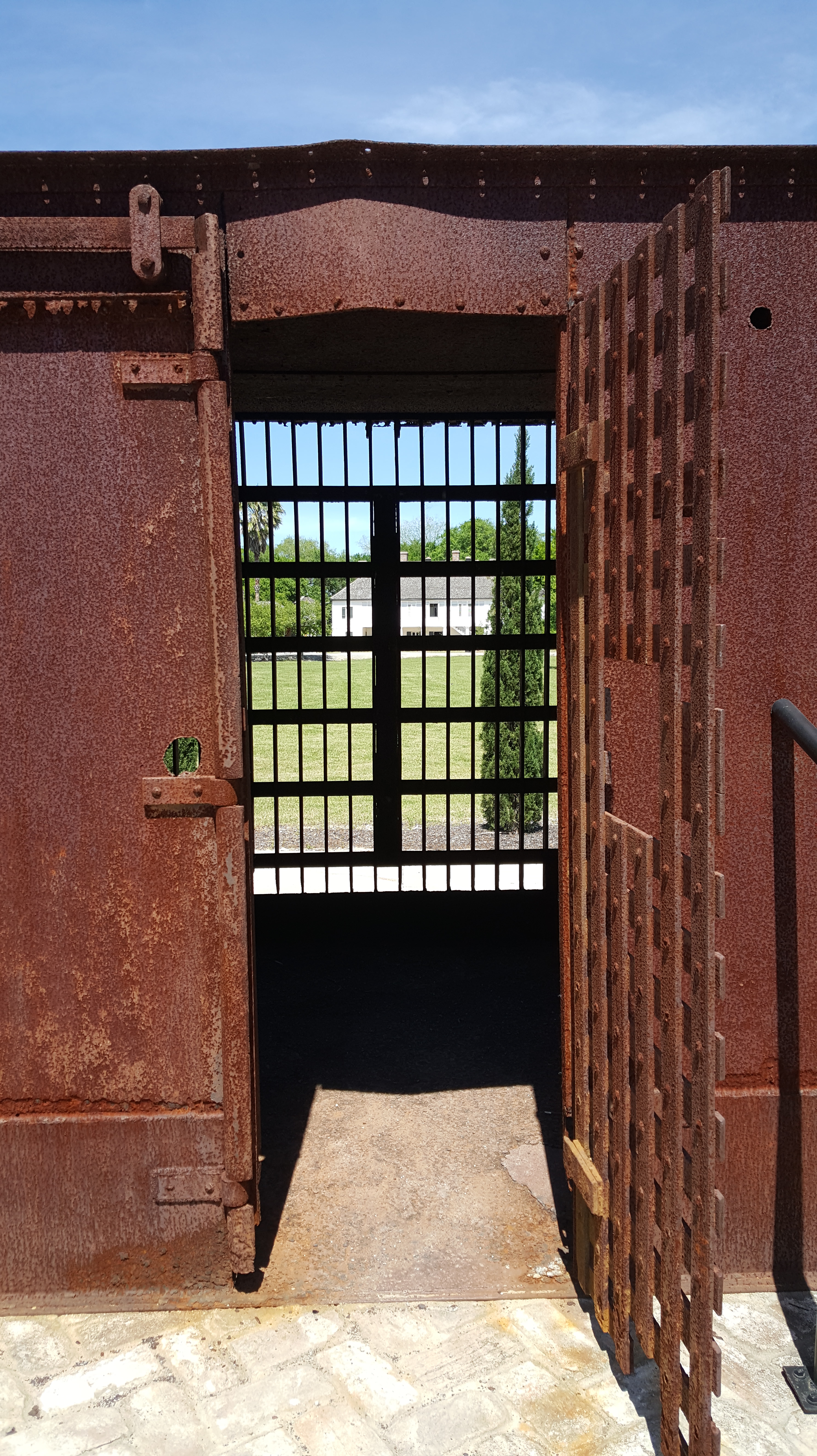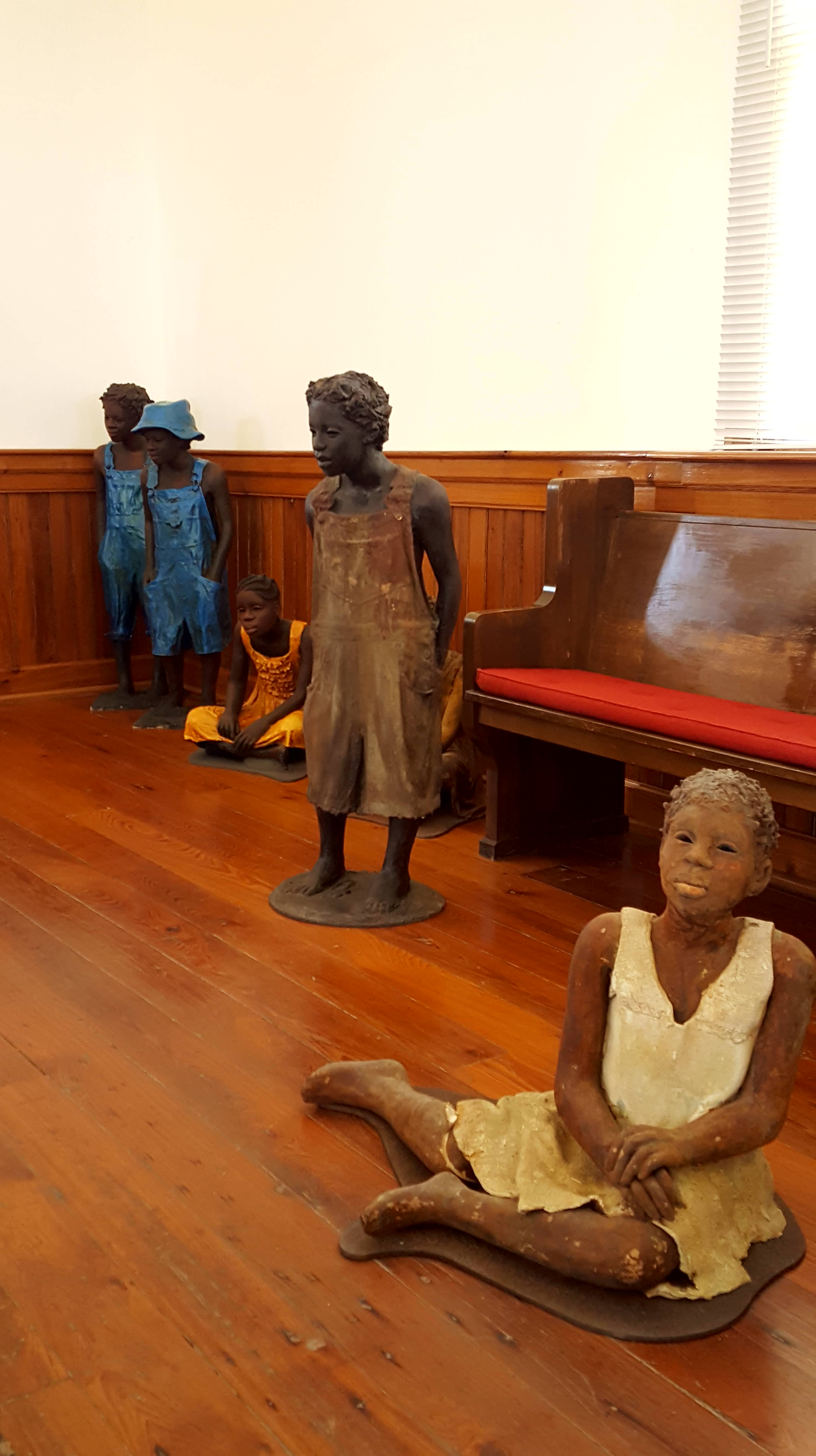 At the Whitney, the iron sugar kettles are not used as flower pots and there is no talk of the sweet scent of sugar wafting through the air. The most prominent building is a church once used by freed Blacks and moved here to feature sculptures of slave children inside. The fields now have a dozen or more monuments with the names of slaves inscribed. There is a “big house” on the property but it is positioned in the back, so it can be viewed through the rusty metal bars of the slave jailhouse. While we are there, a gentle breeze is blowing through some weeping willows and G says she wants to say it’s beautiful here but knows she shouldn’t.